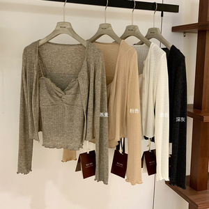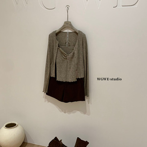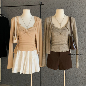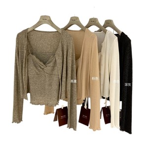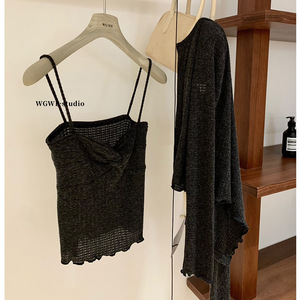 WGWE7066纽结拼接蕾丝背心吊带叠穿针织开衫外套套装