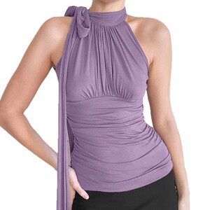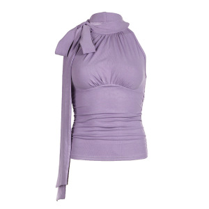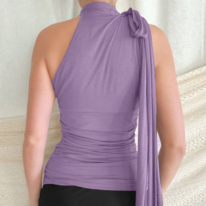 外贸夏季新款欧美跨境纯色气质优雅高领褶皱系带修身无袖背心上衣