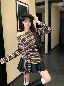 2025大码女装新款条纹斜肩辣妹风不规则长袖上衣