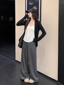 大码女装时尚减龄慵懒穿搭假两件上衣+条纹阔脚裤两件套装