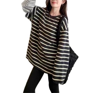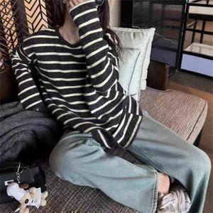 条纹长袖针织衫女2025秋季新款韩系慵懒风宽松中长款毛衣圆领上衣