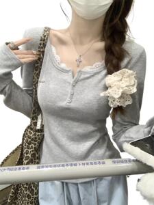 半开领蕾丝纽扣长袖T恤女2025春秋修身1韩系甜美chic内搭打底上衣