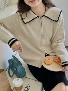 秋冬装撞色海军领学院风双拉链针织衬衫宽松时尚长袖上衣女ZEZ