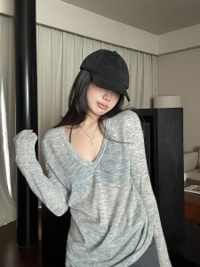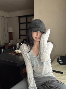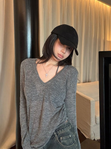 秋季上衣女韩系慵懒风宽松长袖T恤2025新款V领纯色百搭针织打底衫