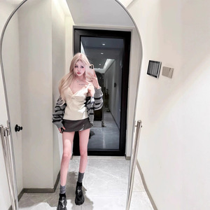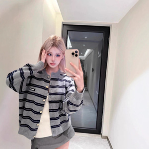 高端女装2025年秋冬新款字母徽标撞色复古条纹长袖针织开衫外套女