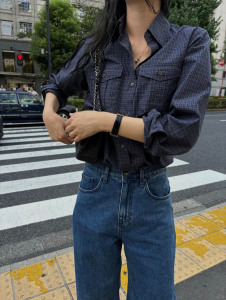 现货2025秋季新韩国东大门th*Bar*net翻领格纹口袋长袖衬衫上衣女