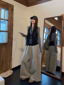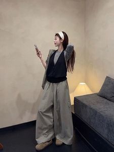 实拍 2025韩系穿搭一整套灰色针织衫+挂脖吊带+水洗工装休闲裤女