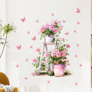 新款跨境创意玫瑰楼梯蝴蝶花卉装饰墙贴用于客厅卧室背景装饰墙贴
