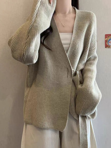 跨境女装中长款针织开衫秋冬新品系腰带修身简约气质纯色毛衣外套