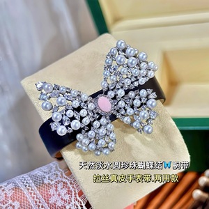 丝带蝴蝶结拉丝牛皮质感天然淡水ak圆珍珠手表腕带多戴款时尚首饰