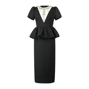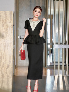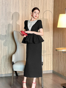 夏季新款重工设计感镶钻收腰荷叶边包臀假两件黑色连衣裙女65453