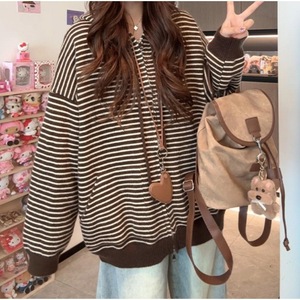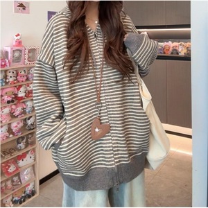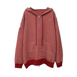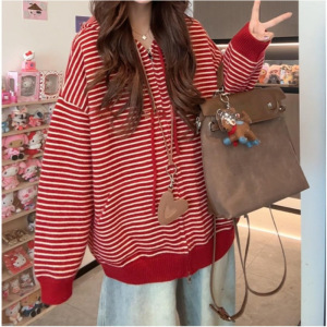 红色条纹拉链连帽毛衣开衫女秋冬季韩系氛围感穿搭慵懒风针织外套