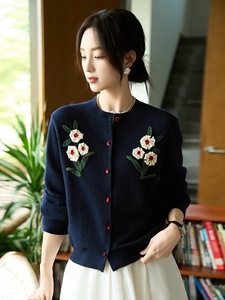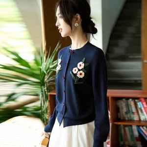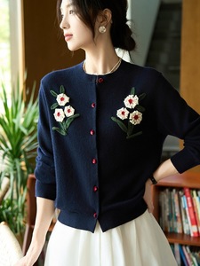 2025年秋冬新款纯羊毛圆领针织开衫长袖女立体钩花设计感保暖上衣