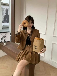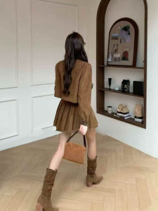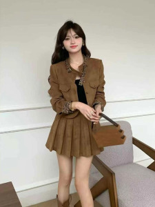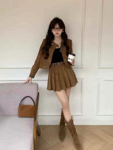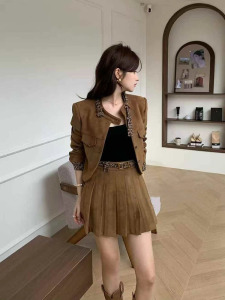麂皮绒时尚套装女2025年秋季新款拼色长袖外套百褶短裙洋气两件套