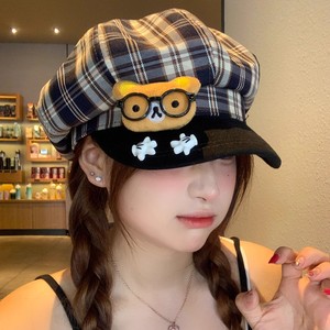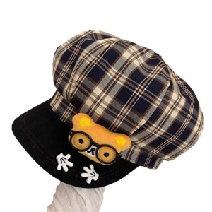 可爱卡通小熊玩偶格子八角帽女秋季甜美可爱显脸小云朵贝雷帽子潮