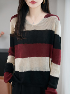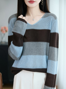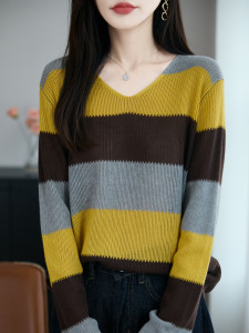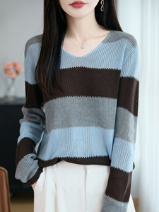 韩系时尚氛围感撞色V领针织衫女早秋宽松长袖减龄休闲条纹毛衣