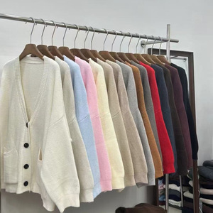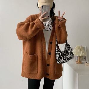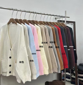 欧美跨境新款纯色宽松大码慵懒风V领毛衣外套加厚纯色简约针织衫