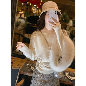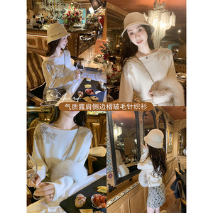 鱼兔子的兔子 春秋新款时尚高级内搭羊绒衫女露肩侧边褶皱针织衫