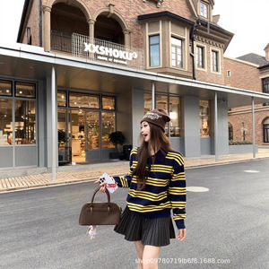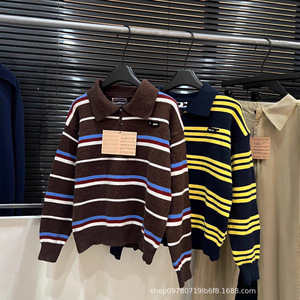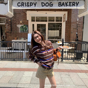 【不支持退货】欧洲站美拉德复古慵懒风撞色条纹棕色针织毛衣