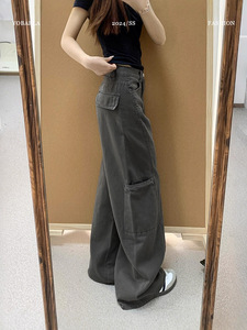 灰色阔腿牛仔工装裤女2025春秋款新款高腰宽松显瘦百搭口袋拖地裤