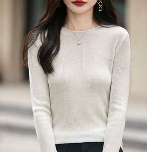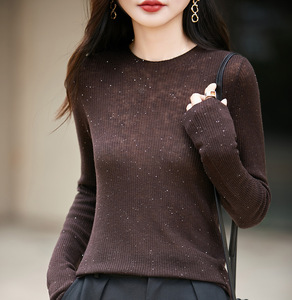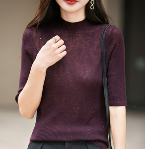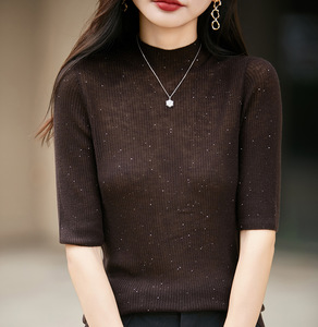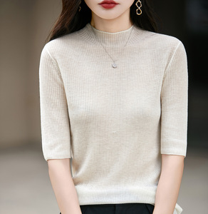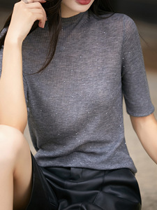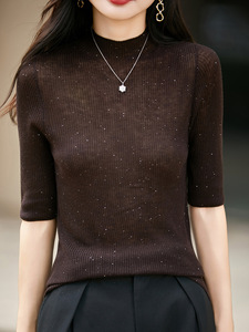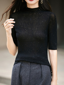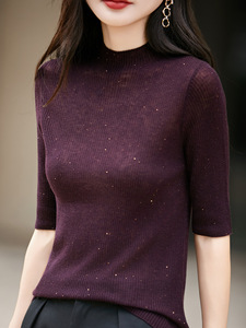 扬子纱打底衫珠片半高领针织短袖修身t恤五分袖上衣高级感羊毛衫