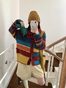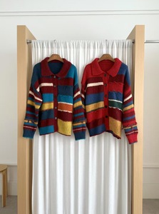 日系复古拼接翻领毛衣开衫女外套秋冬韩版长款针织上衣