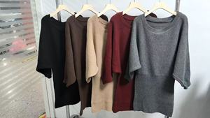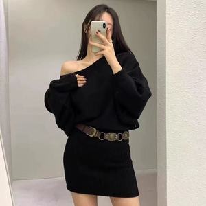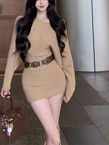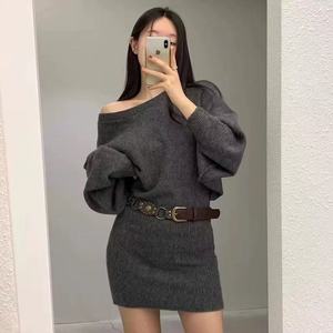 跨境美式辣妹慵懒高级感秋冬针织连衣裙宽松蝙蝠袖露肩短款包臀裙