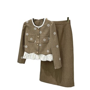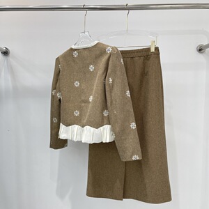 气质优雅套装春秋新款圆领长袖时尚绣花撞色拼接短外套高腰长半裙