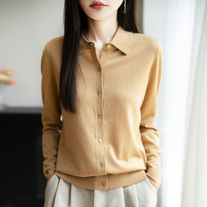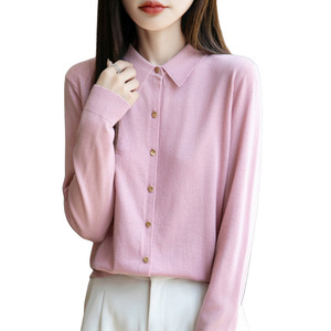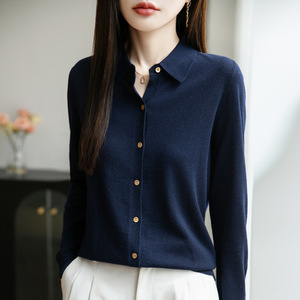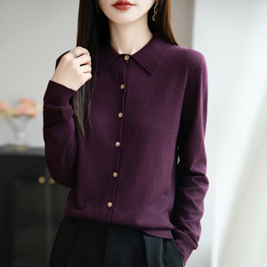 POLO领精纺羊毛针织开衫女秋冬新款衬衣领叠穿翻领打底衫上衣批发