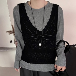 2025早秋新款时髦韩系圆领镂空针织马甲女宽松显瘦百搭两件套上衣