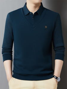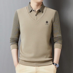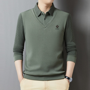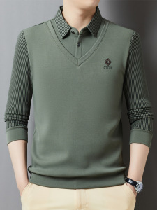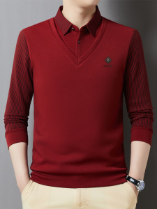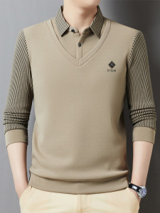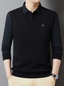 跨境现货男士POLO衫长袖春秋季高级感时尚条纹袖假两件t恤衫上衣