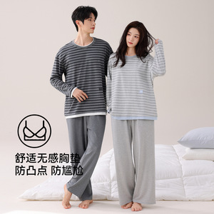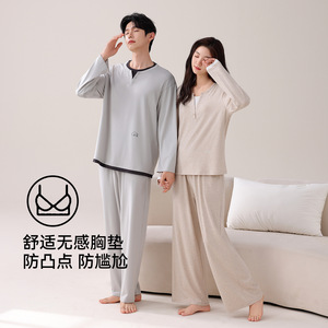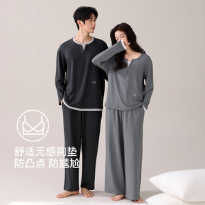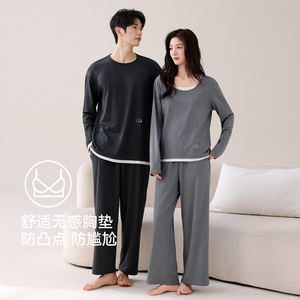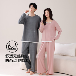 RC莫代尔带胸垫情侣睡衣秋季圆领套头假两件长袖长裤宽松休闲大码
