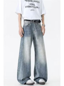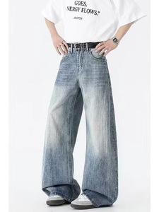 夏季美式复古cleanfit竹节纹弯刀牛仔裤男女潮牌百搭宽松阔腿长裤