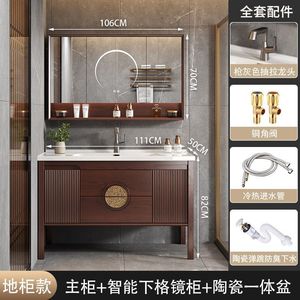 新中式陶瓷一体盆浴室柜组合乌金木落地式双盆心新款洗手洗脸盆柜
