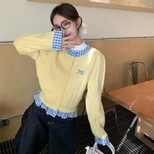 设计感开衫针织外套女秋季洋气拼接韩系初中高中生女大童排扣毛衣