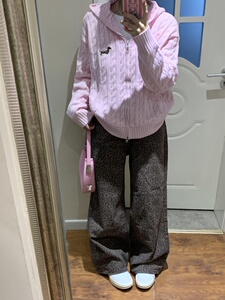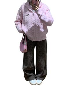 秋季韩系chic穿搭粉色麻花连帽开衫毛衣女宽松外穿慵懒风针织上衣