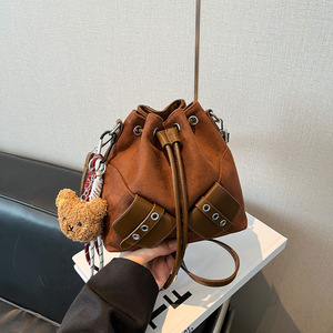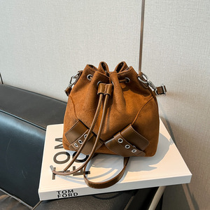 超火小众复古麂皮绒包包女2025新款精致百搭斜挎包超火束口水桶包
