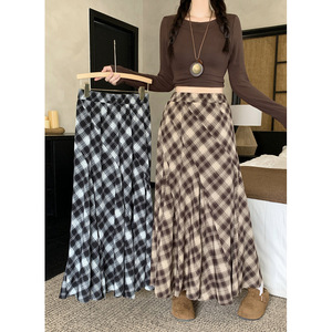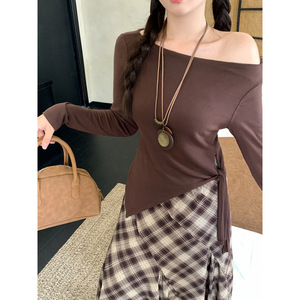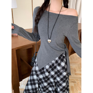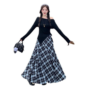 2025秋装新款胖mm大码女时尚露肩不规则长袖格子半身裙套装