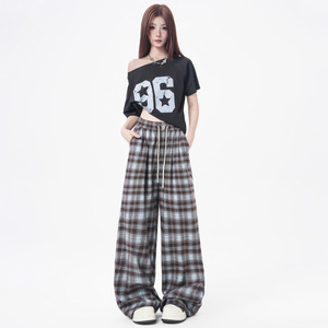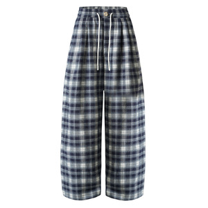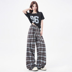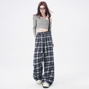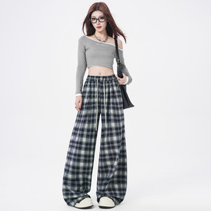 秋冬新款格子休闲裤宽松紧腰高腰阔腿裤女秋季慵懒显瘦格纹拖地裤