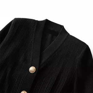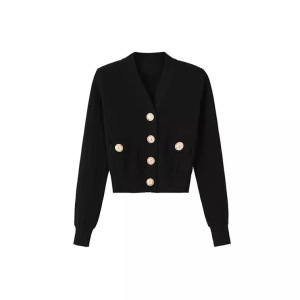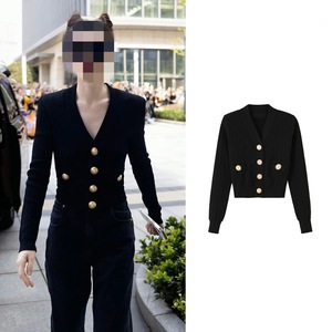 长期现货2025秋冬戚薇明星同款黑短款V领针织衫金属显瘦开衫外套
