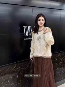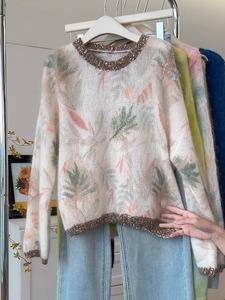 韩系印花圆领拼接毛衣女秋冬慵懒高级感气质宽松复古软糯针织上衣