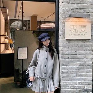 条纹立领风衣女短款秋季新款收腰系带显瘦休闲短外套百搭修身遮肉