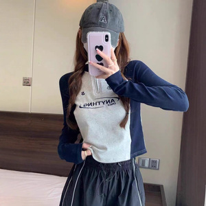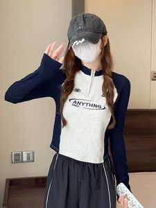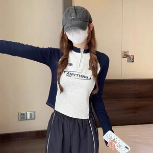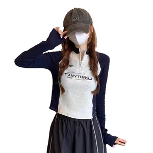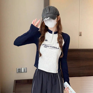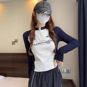 美式复古T恤长袖女秋季新款修身拉链内搭打底衫短款撞色刺绣上衣