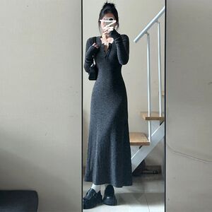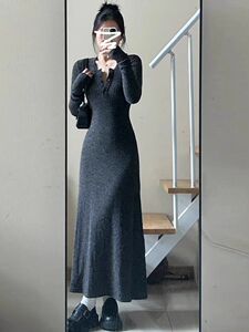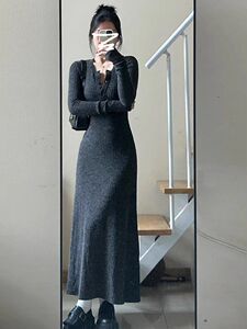 韩版气质新款法式冬季长裙收腰裙子显瘦修身打底长袖条纹连衣裙女