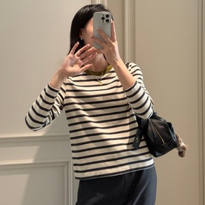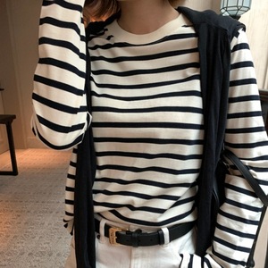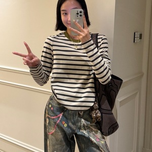 COS同款平替女式T恤25秋季新款条纹圆领撞色标准版条纹宽松长袖