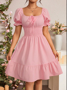 2025跨境欧美女装亚马逊夏季新款抽褶荷叶边A字裙方领短袖连衣裙