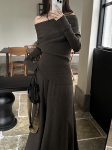 5werkwen rattan系列 三穿一字领毛织上衣大A摆半裙针织套装秋冬