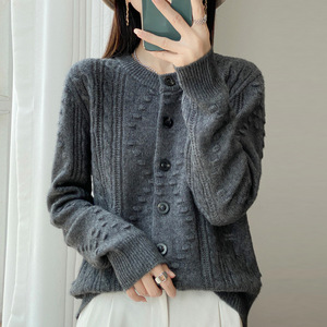 软糯天丝羊毛开衫女圆领厚款毛衣秋冬新款宽松针织女装上衣外套