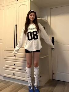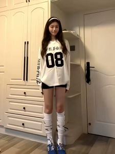 国潮牌梵文印花贴布绣球衣t恤女秋季美式设计感网眼运动长袖上衣
