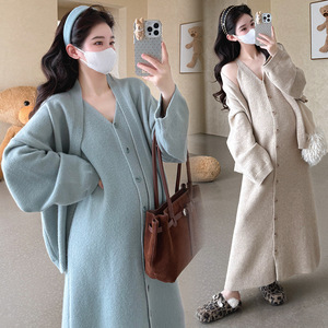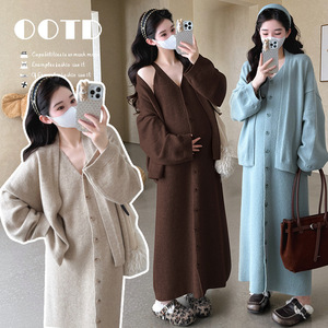 孕妇装秋冬新款时尚简约宽松毛衣开衫外套+针织吊带连衣裙两件套